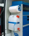 Craftsmen and specialists who work on location at the client’s home or workplace, on the road, or at constructions sites, often need to wash their hands quickly and easily. At times, it is also necessary to clean mechanical parts, tools and equipment while on the job. Syncro System accessories make that possible. The Syncro System 10-litre water jug with spout, complete with mounting system, attaches to the door or to the side of the module panels. And thanks to the convenient soap dispenser, all you need to do is open the door of the van, turn the spout and wash your hands!