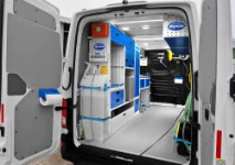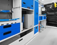 - A work bench, covered in stainless-steel for maximum strength, is located near the bulkhead. The bench is equipped with a metal vice and illuminated by an LED light. The work top itself is supported by a series of six metal drawers with non-slip mats and internal space dividers. The floor-level compartment is equipped with hooks and straps, making it ideal for carrying the compressor and inverter. The top section of racking consists entirely of pull-out transparent containers in two different sizes. An electric power panel with switchgear is installed on the bulkhead behind the cab.